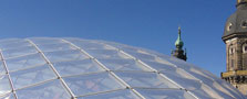 Die Eisfläche und der umlaufende Zuschauerrang werden durch ein Membrandach komplett stützenfrei überdacht.