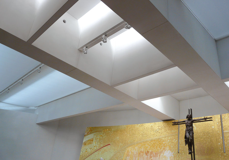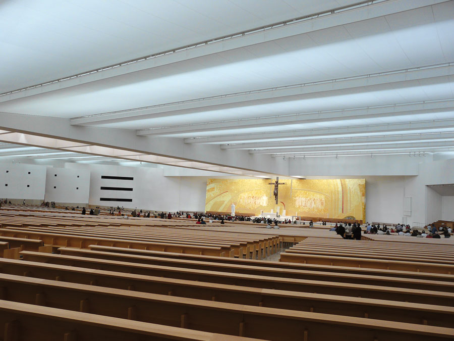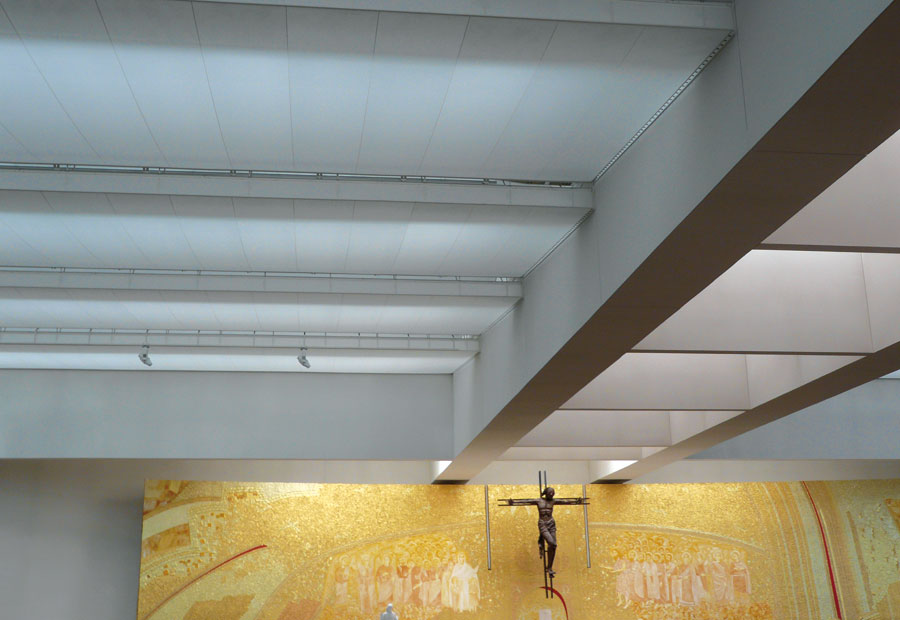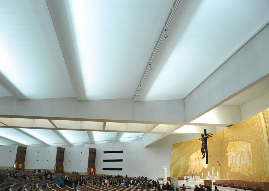 Unter dem Dach der Kirche, das einen Durchmesser von 100 m hat und von nur 2 gewaltigen Betonträgern getragen wird, kam eine Lichtdecke zur Ausführung. Die freitragende Konstruktion aus 18 Einzelmembranen besteht aus Rahmen, die mit Helioflon- Lichtgewebe bespannt sind. Die Rahmen haben eine Größe von bis zu 600m² je Lichtdeckenelement.