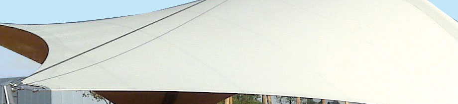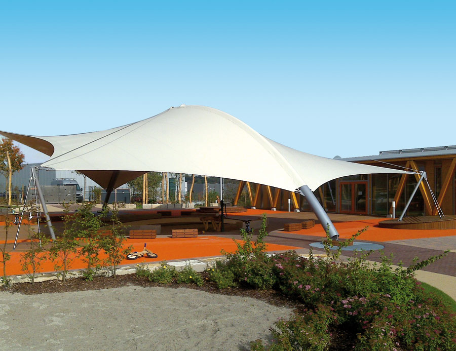 Dieses freistehende Bogendach bestehend aus einem 23 m langen Rundstahlträger, der mit 300 m2 PVC-Gewebe überspannt ist, wird von vier Haltepunkten fixiert und in diese organische Form gebracht.
