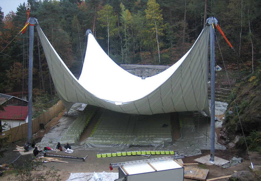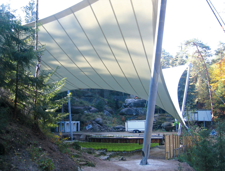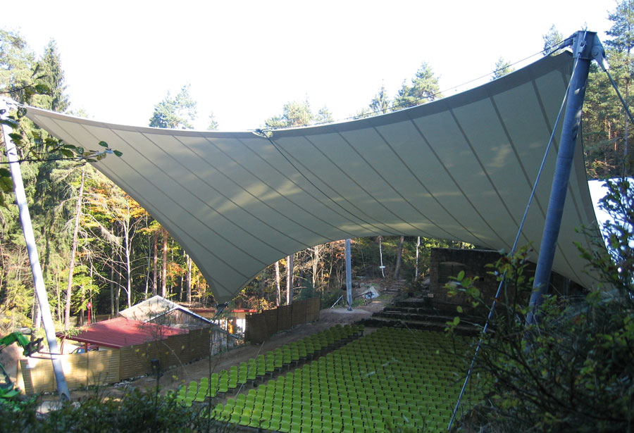 Die Vier-Punktmembrane überspannt den gesamten Zuschauerbereich und bildet gleichzeitig eine eindrucksvolle Kulisse für die Freilichtbühne. Das Dachtragwerk ist eine selbsttragende, zugbeanspruchte Gewebemembran aus PVC-beschichteten Polyestergewebe.